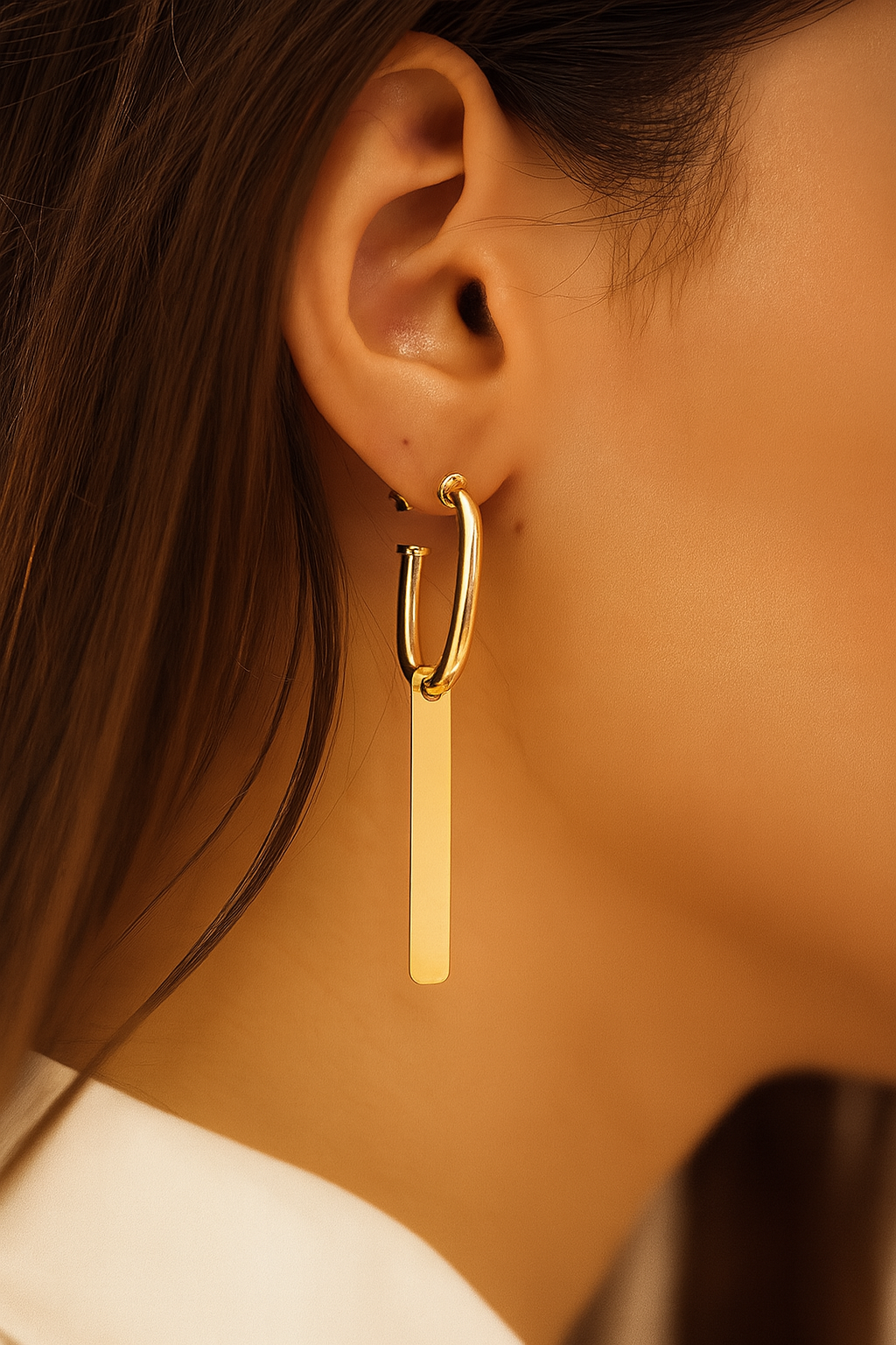 The 18K Yellow Gold Bar Hoops bring structure to softness. Their vertical drop elongates the neck and sharpens any silhouette, perfect with tucked blazers, open collars, or a sleek bun. They are made to elevate the everyday and anchor your boldest looks. Clean lines, maximum impact.
