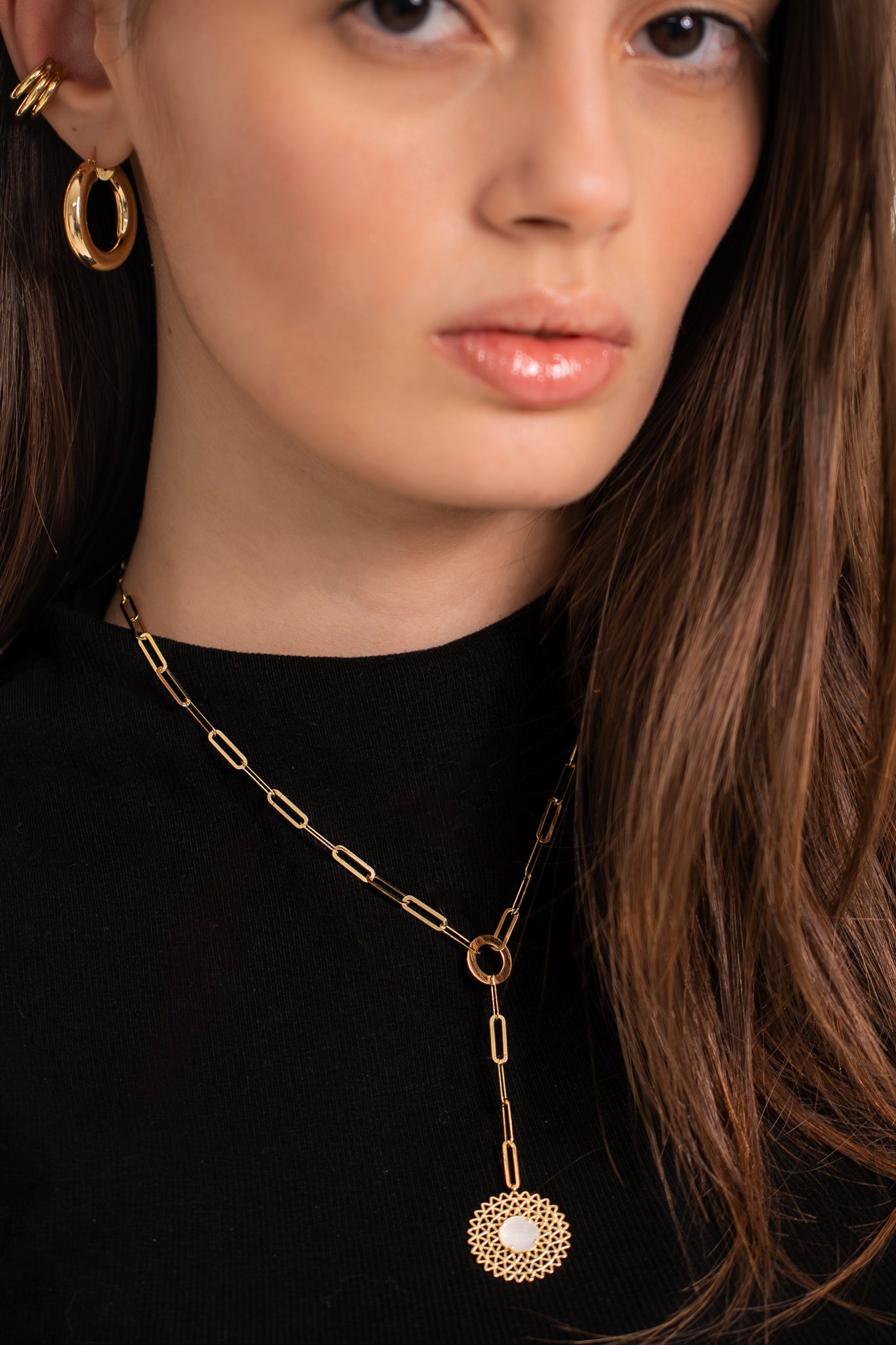 Wear the 18K Yellow Gold Chain Y Necklace with Sunburst Medallion solo to let the medallion shine, or layer it with a shorter fine chain for a more sculptural neckline. Pairs beautifully with our 18K Yellow Gold Hoops for added radiance.